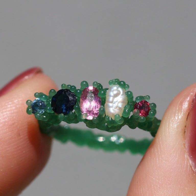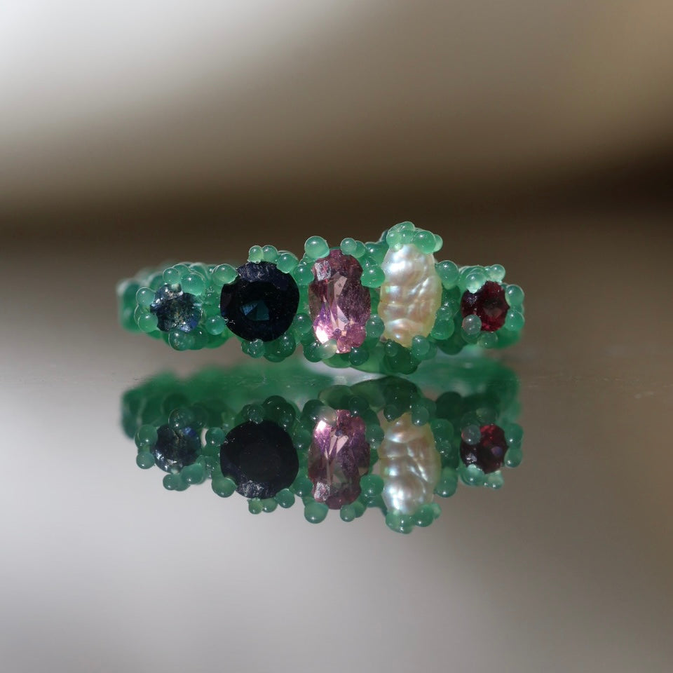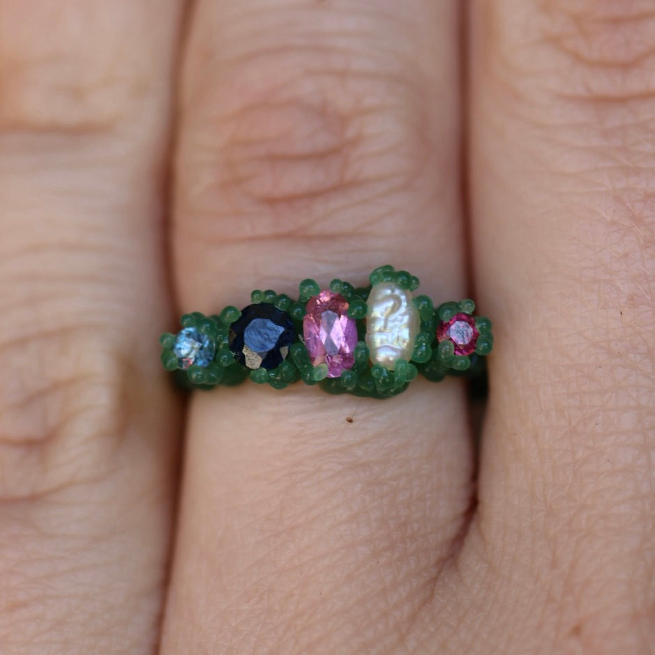 A cluster of round cut sapphires and garnets, oval tourmaline natural pearl set in your choice of sterling silver or 9ct yellow/rose/white gold.