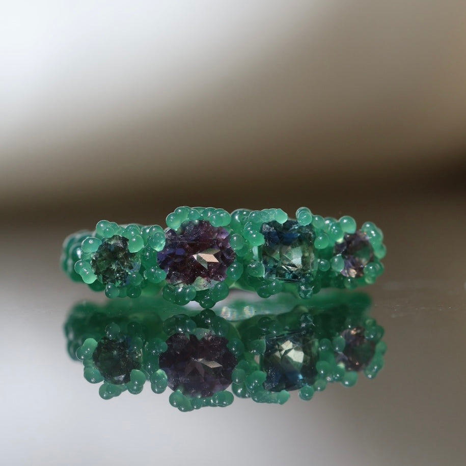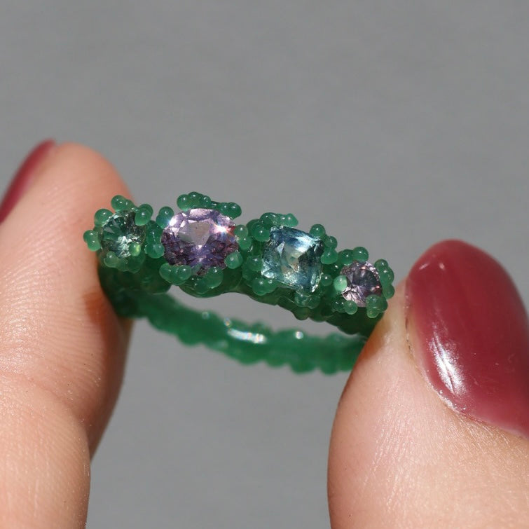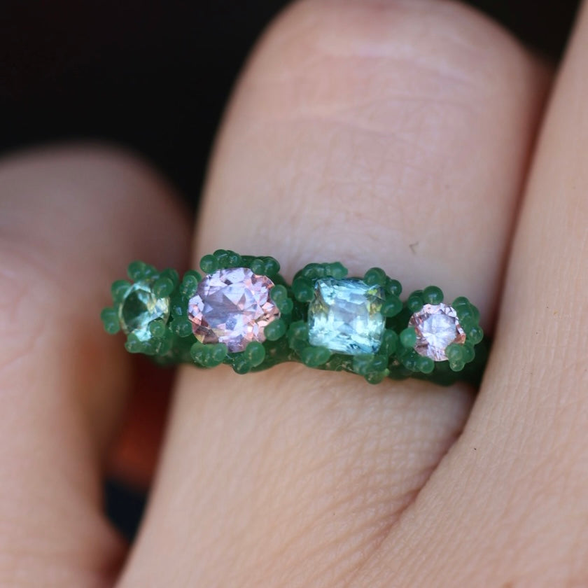A sea foam green sapphire, lavender spinel, green cushion cut sapphire and a dusty rose zircon set in bubbling textured sterling silver or 9ct yellow/rose/white gold.