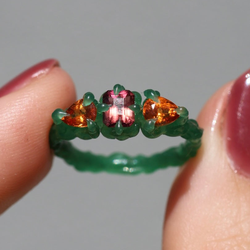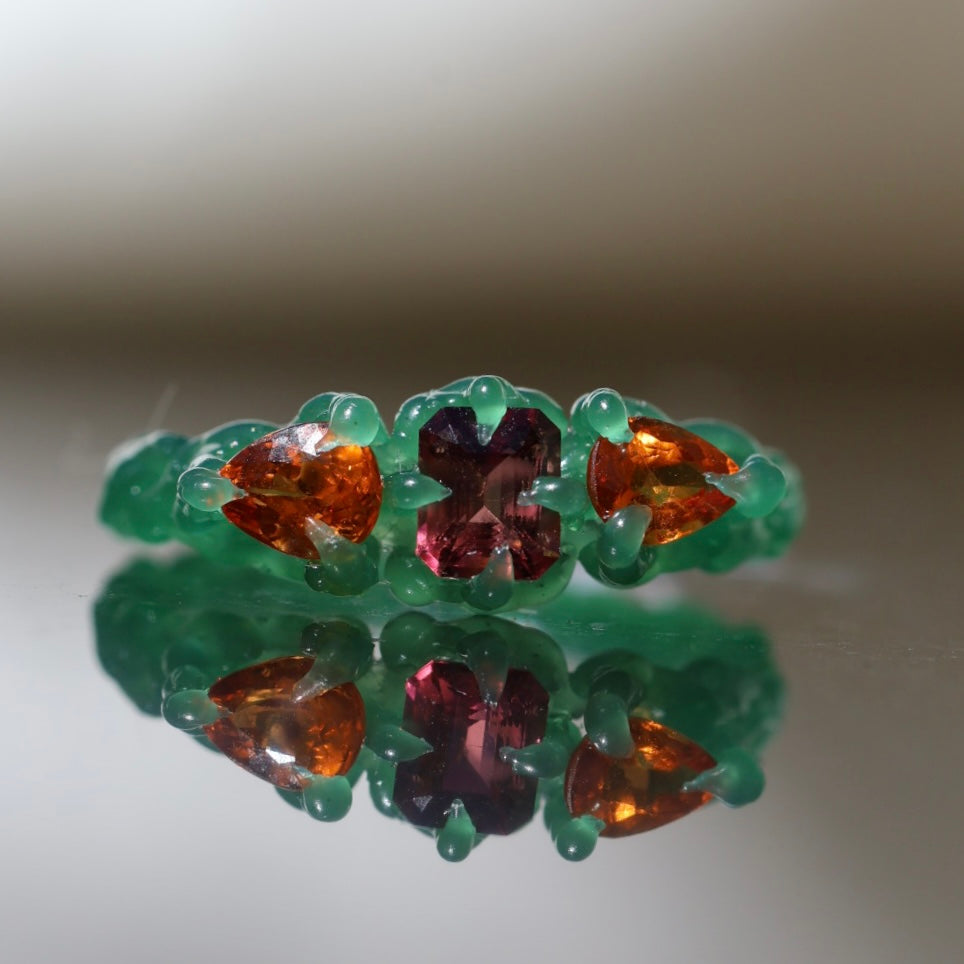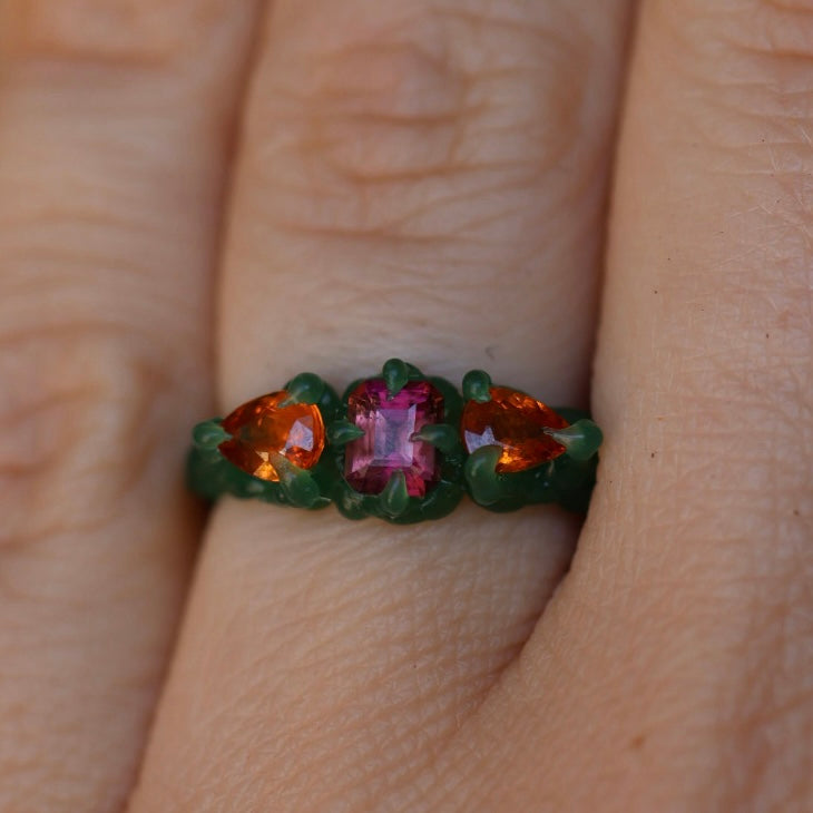 Sunset magenta and orange tourmaline set between two pear shaped fiery orange spessartite garnets in clawed prongs.