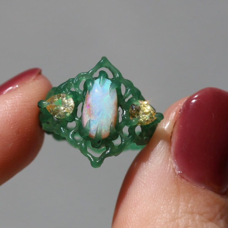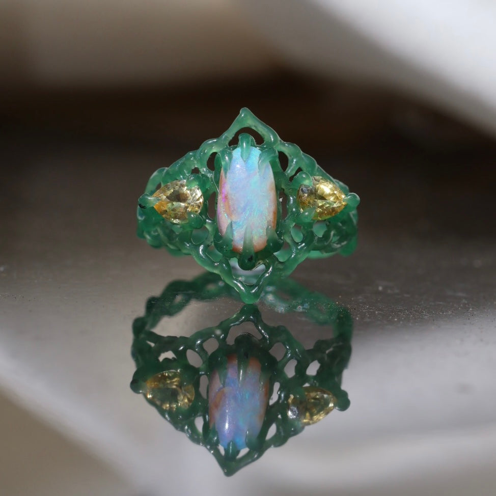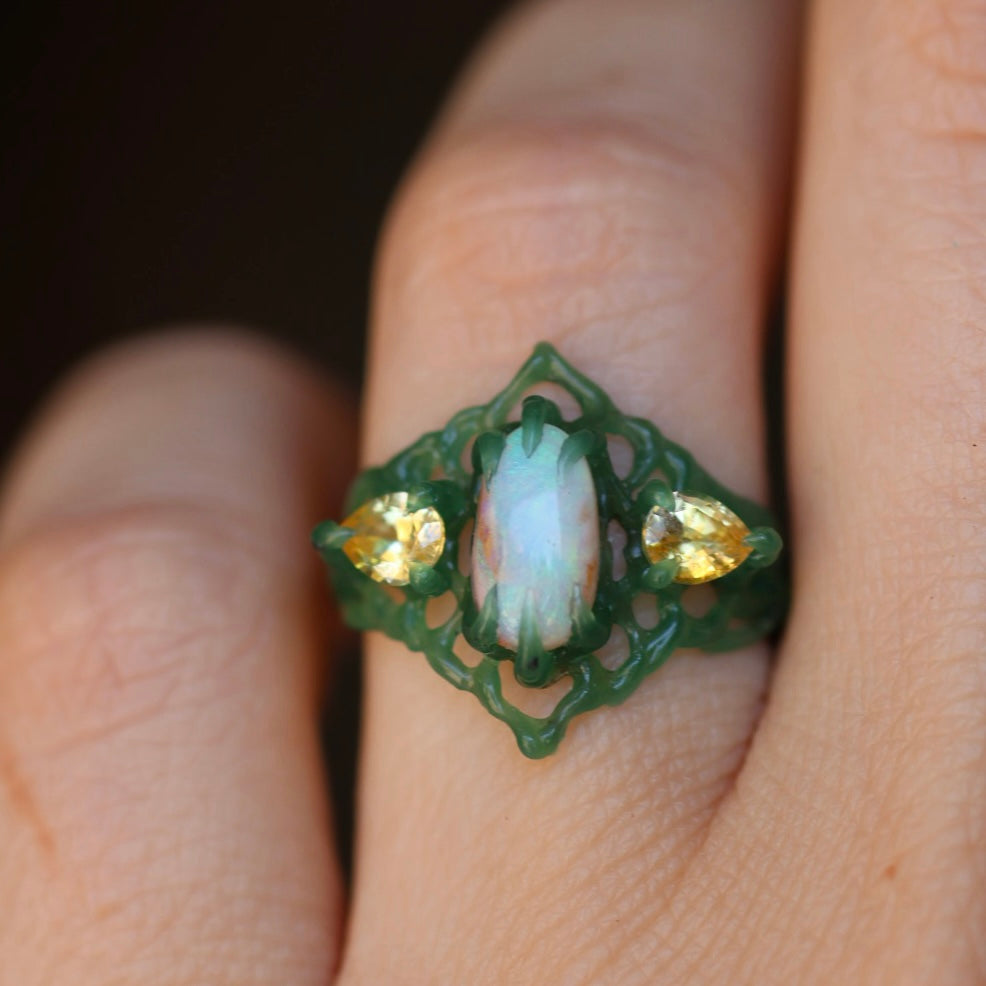 Elongated oval cut boulder opal between two pear shaped yellow sapphires set in your choice of undulating sterling silver or 9ct yellow/rose/white gold.