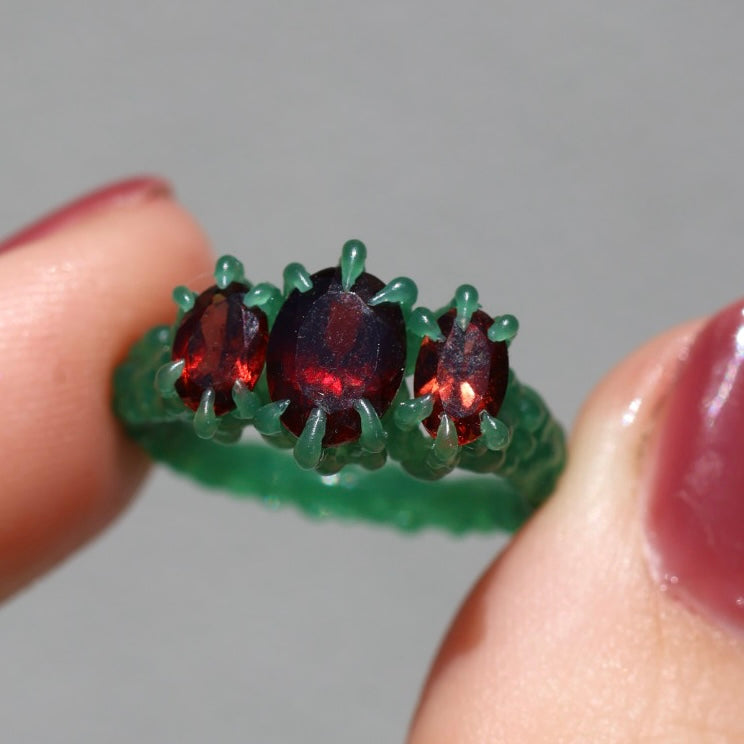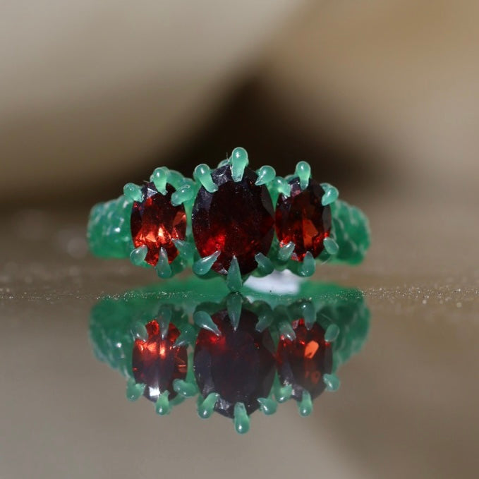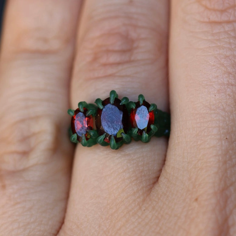 Blood red oval cut garnet set between a pair of slightly smaller red oval cut garnets in your choice of sterling silver or 9ct yellow/rose/white gold.