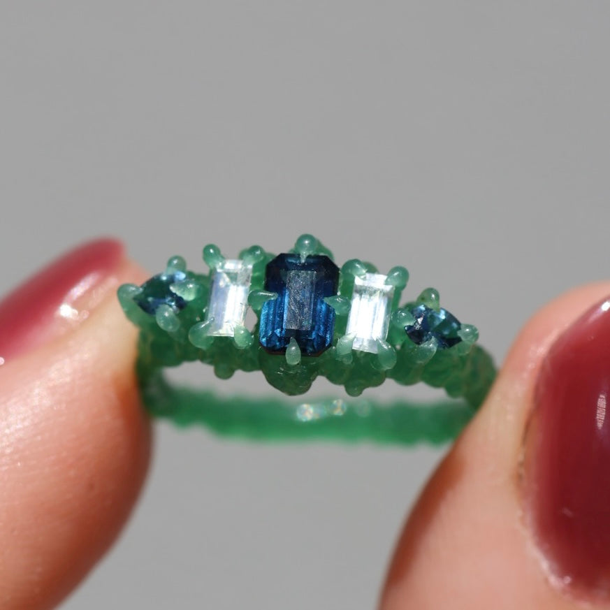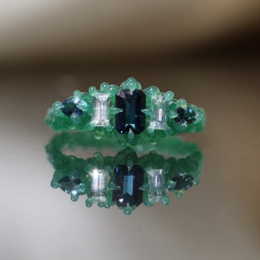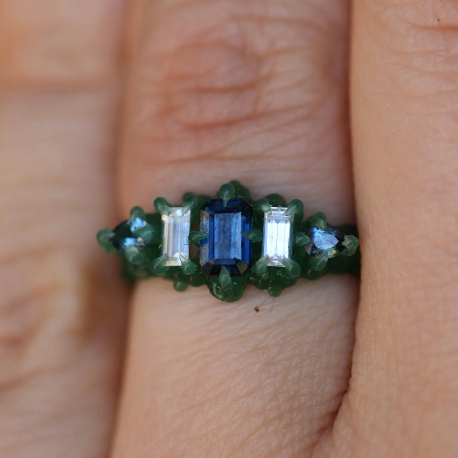 An emerald cut blue sapphire, between two baguette cut white sapphires and pear shaped teal blue sapphires set in spiked sterling silver or 9ct yellow/rose/white gold.