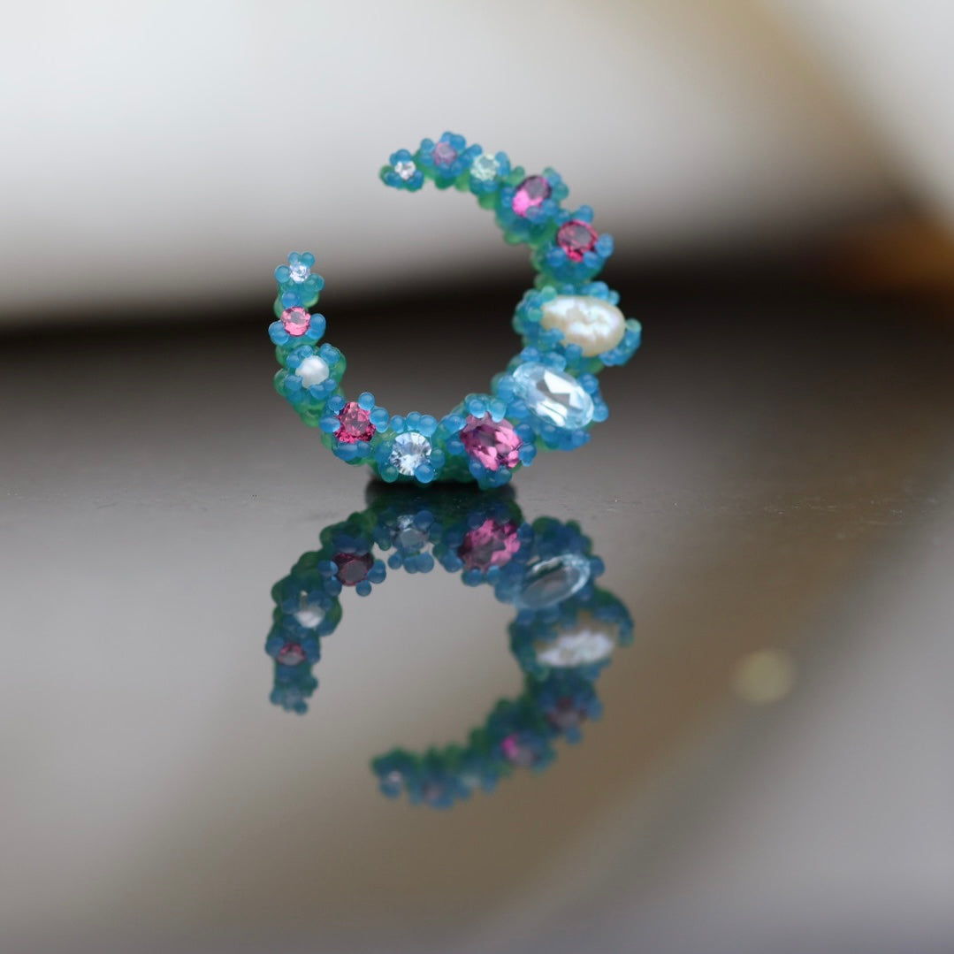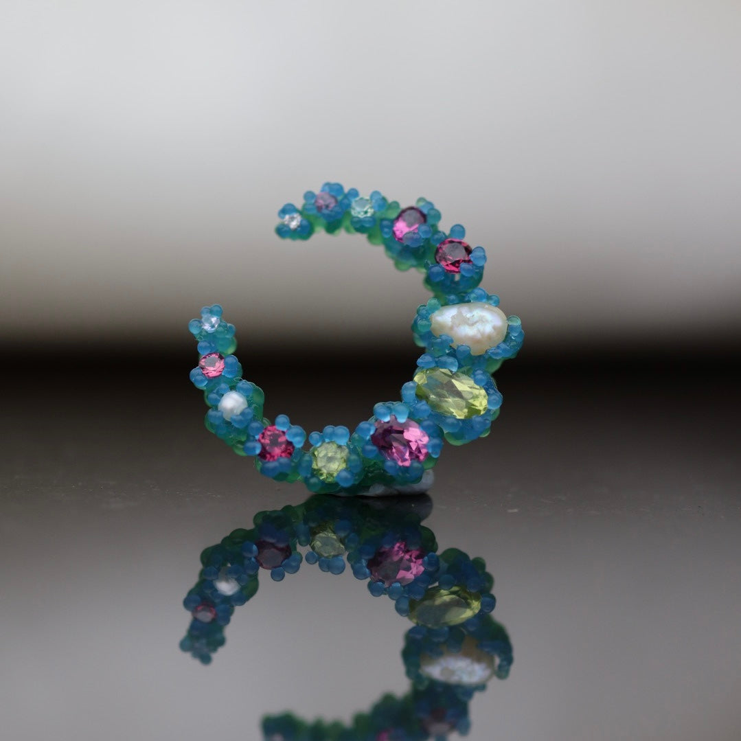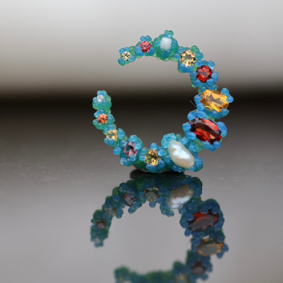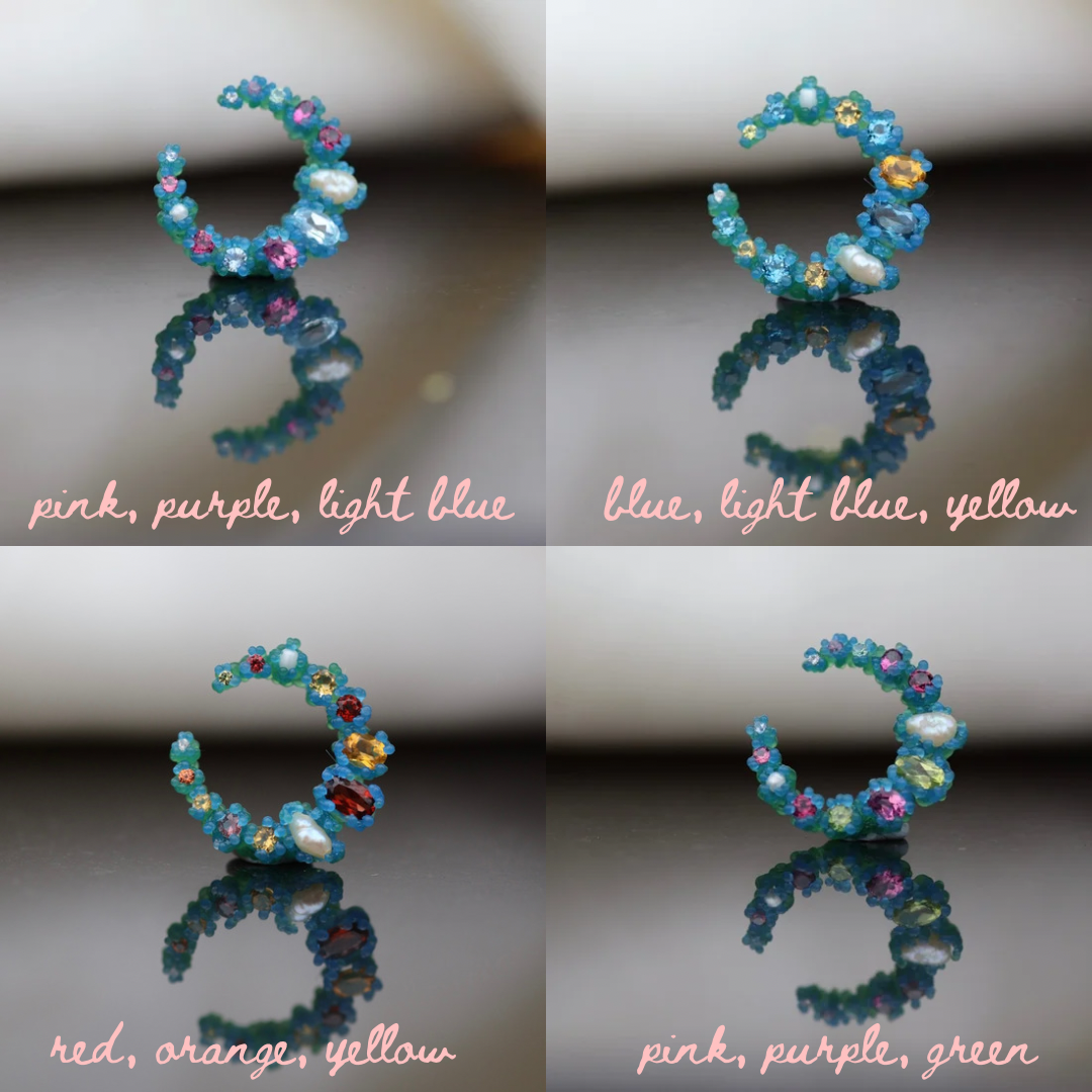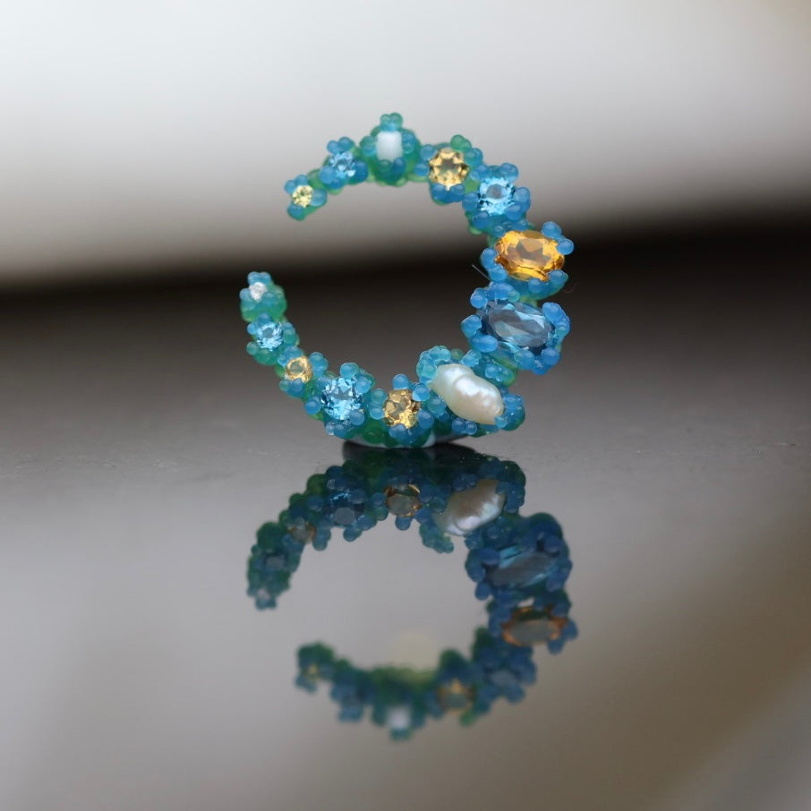 Cresent moon shaped earrings with an array of 26 gemstones, the pair pictured features deep blue london topaz, yellow citrine, natural pearls, yellow sapphires, and a pair of salt and pepper diamonds.